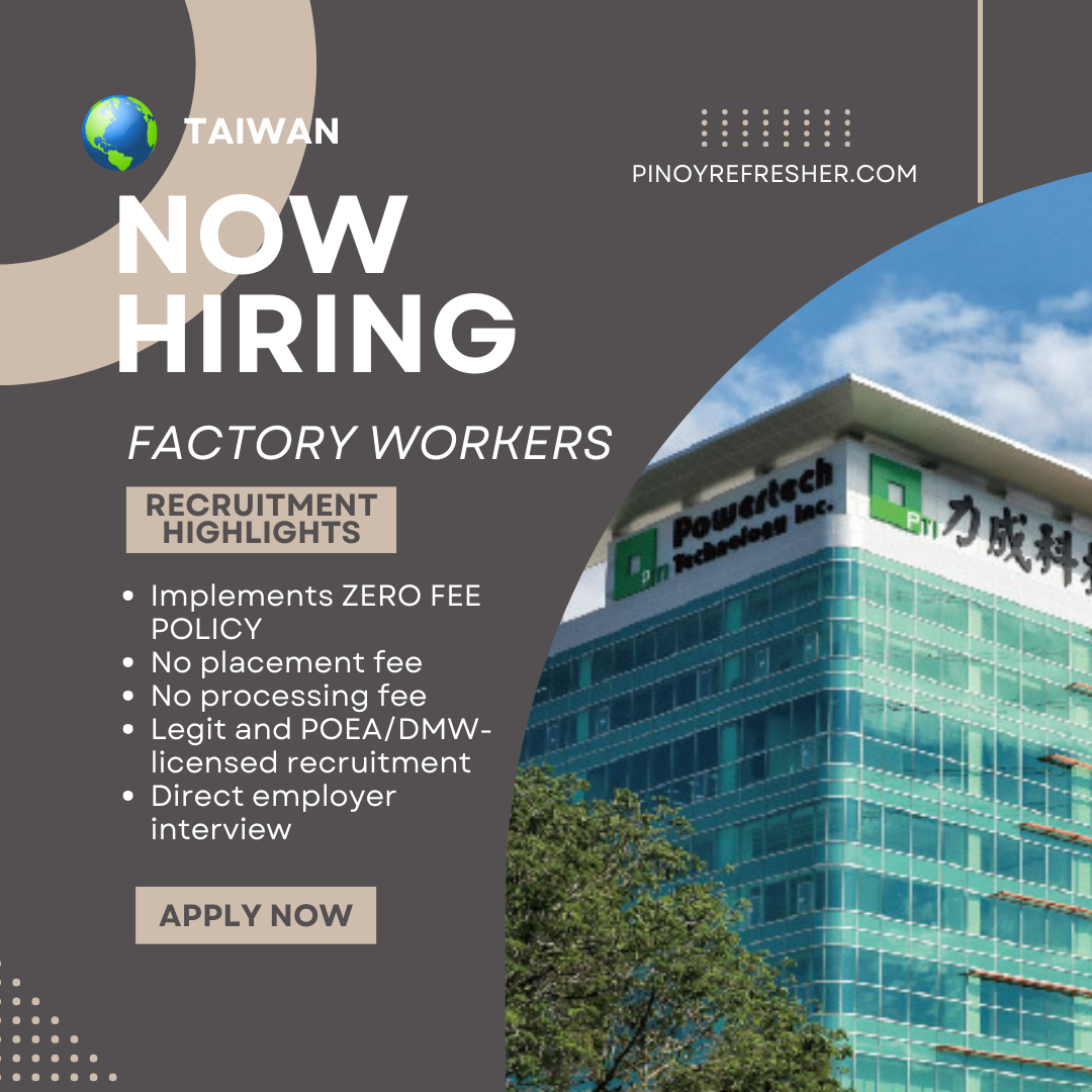 ๐น๐ผ HIRING FACTORY WORKERS / MACHINE OPERATORS FOR TAIWAN Powertech Technology Inc. (PTI) | Hsinchu, Taiwan Everbest Overseas Employment Agency Inc. is currently accepting qualified