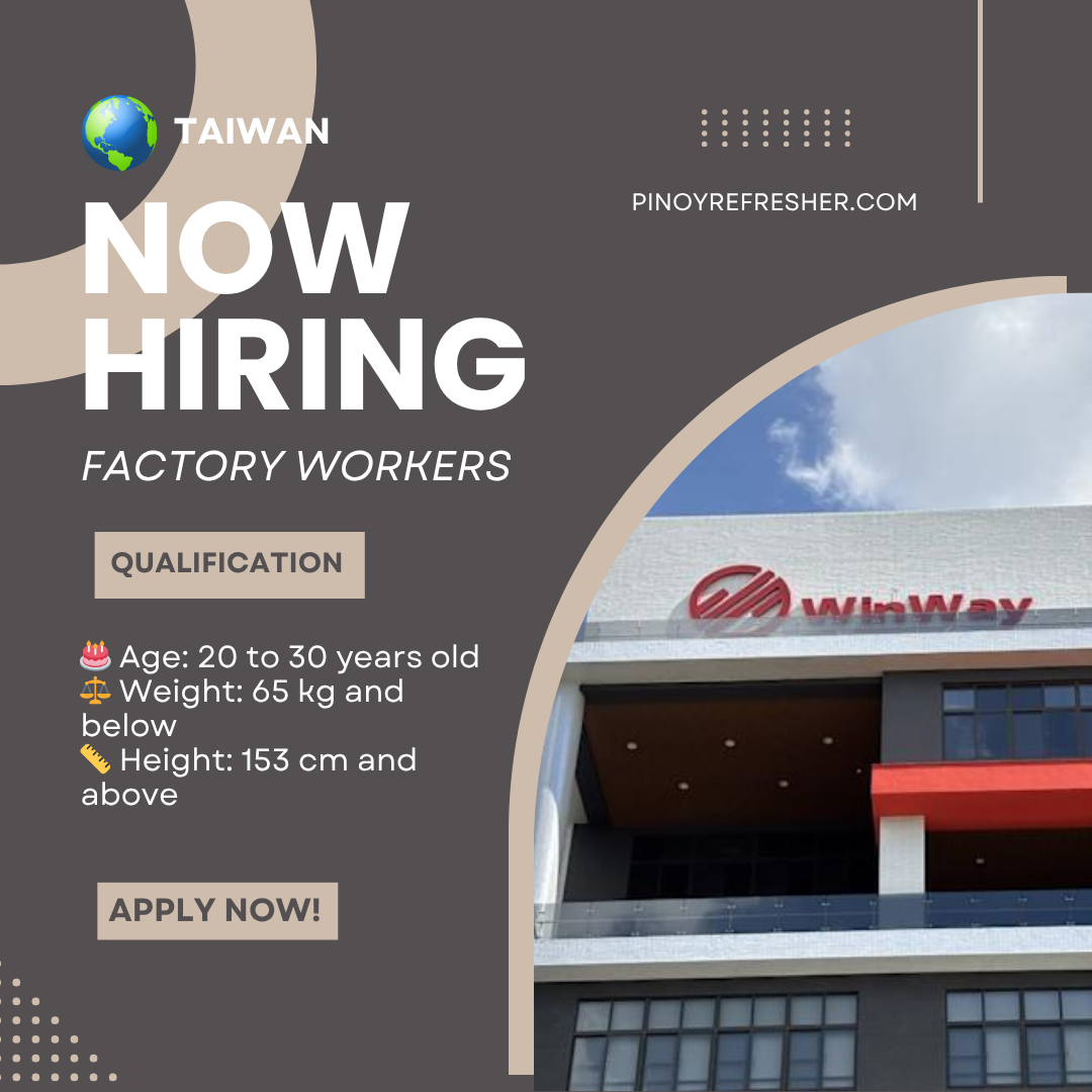 🇹🇼 HIRING: MACHINE OPERATORS FOR TAIWAN! 📍 Location: Taichung City, Taiwan🏢 Principal / Employer: Winway Tech Co. Ltd💰 Salary: TWD 28,590 🏭 About the Company