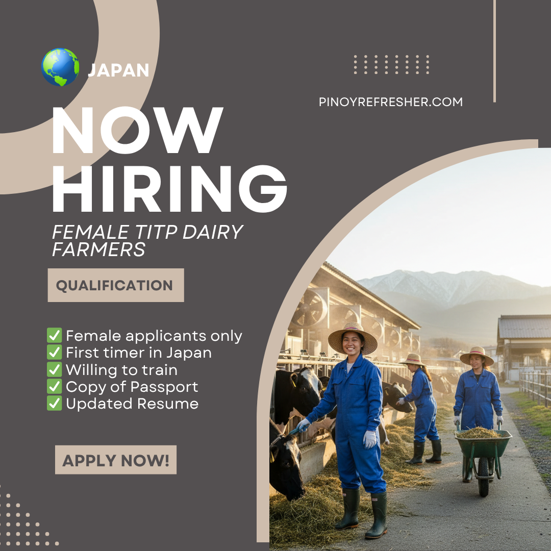 🇯🇵 Now Hiring: Female TITP Dairy Farmers Bound for Japan (2025) Agency: Luzern International Manpower Services CorporationPosition: TITP Dairy FarmerLocation: JapanFor Manpower Pooling Only Job