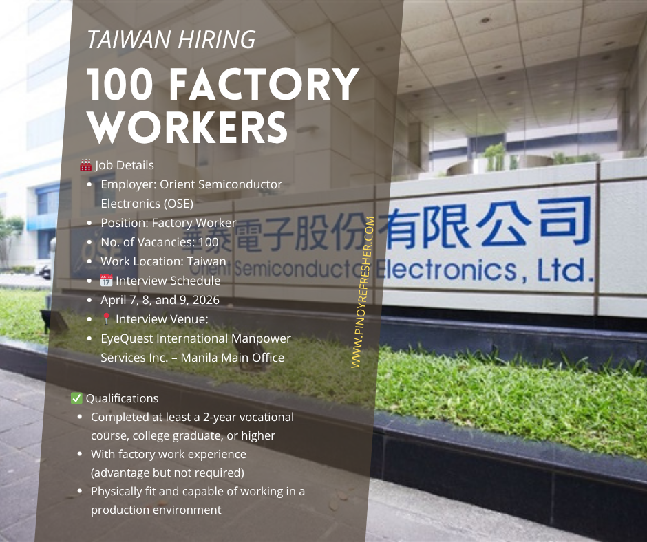 🌍🔧 Job Opportunity in Taiwan 🇹🇼 Factory Workers Needed – 100 Openings EyeQuest International Manpower Services Inc. is now hiring Factory Workers for deployment to