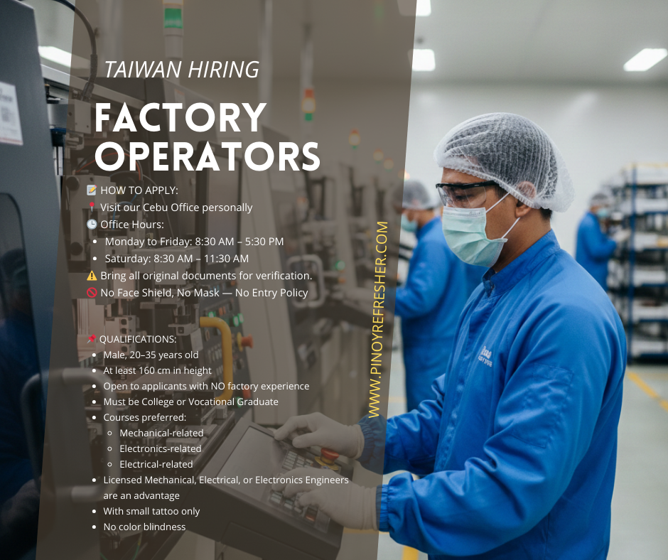 πΉπΌ TAIWAN JOB OPENING β FACTORY WORKER πΉπΌ Grand Placement & General Services Corp. is now accepting applicants for Factory Worker positions in Taiwan. This