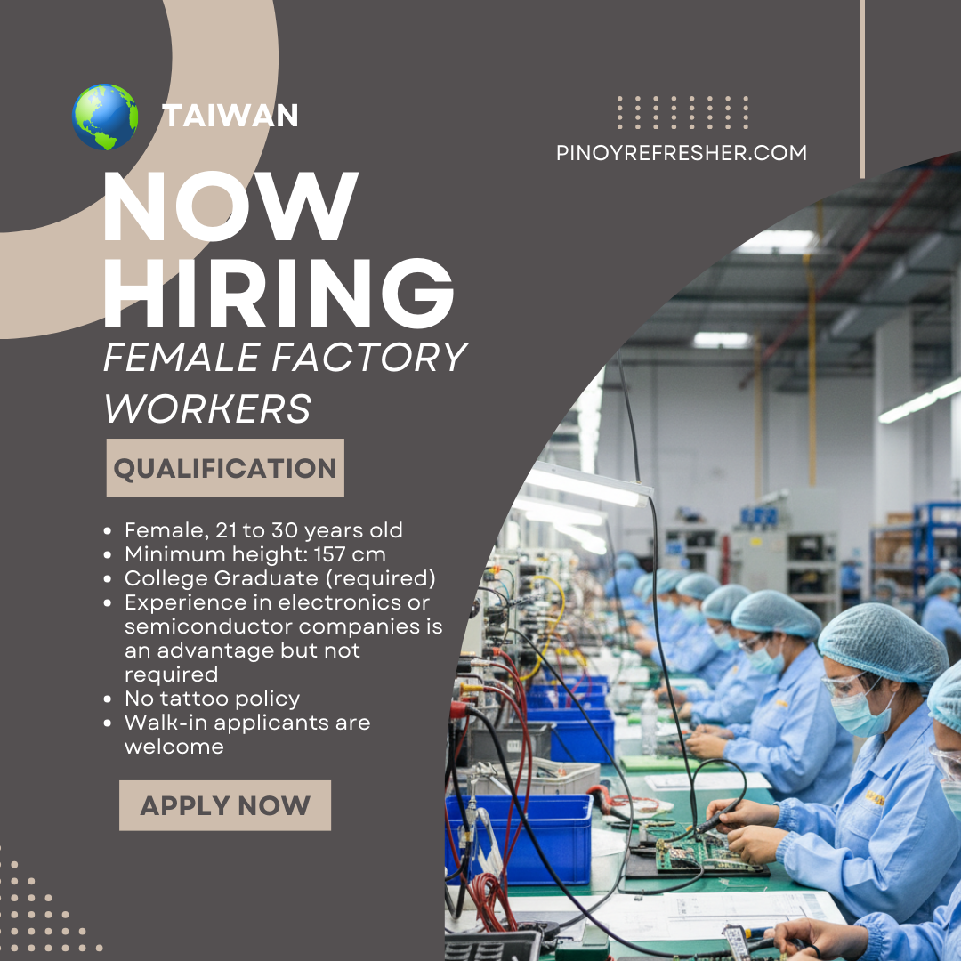 π¨ URGENT HIRING: FEMALE WORKERS FOR ELECTRONICS FACTORY A reputable electronics manufacturing company is now urgently hiring Female Factory Workers. This is an excellent opportunity