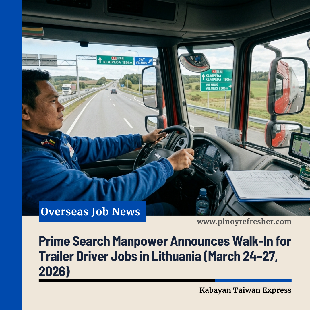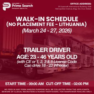 Manila, Philippines – Prime Search Manpower Agency Inc. announced a walk-in schedule for Filipino applicants seeking trailer driver positions in Lithuania. The recruitment drive runs from March 24 to 27, 2026, offering qualified drivers an opportunity to work abroad with competitive wages and benefits.