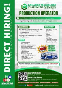 Batangas, Philippines β Job seekers in the manufacturing sector have a new opportunity as a hiring drive opens for Production Operators at the First Philippine Industrial Park (FPIP) in Tanauan City. The recruitment supports operations of Brother Industries (Philippines) Inc., a globally recognized name in electronics and industrial manufacturing. πΌβ¨