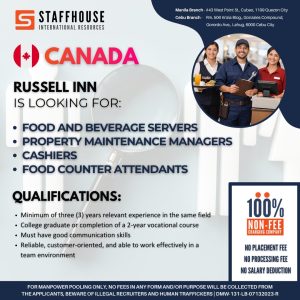 Manila/Cebu, Philippines — Russell Inn, a reputable hospitality and property management establishment in Canada, is now hiring Filipino professionals through Staffhouse International Resources. This international recruitment drive offers qualified candidates the opportunity to advance their careers abroad in a dynamic and service-oriented environment.