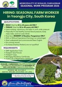 The local government is calling for qualified residents of Rosales, Pangasinan to apply for seasonal farm worker positions in Yeongju City, South Korea. This is an excellent opportunity for hardworking individuals to gain international experience and earn abroad.