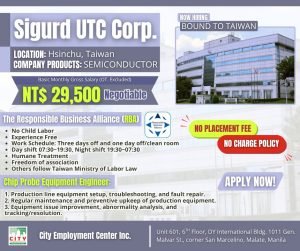 Hsinchu, Taiwan — Filipino workers seeking opportunities abroad can now apply for semiconductor industry positions as City Employment Center Inc. announces urgent hiring for Chip Probe Equipment Engineers to be deployed at Sigurd UTC Corp. in Hsinchu, one of Taiwan’s leading technology hubs.