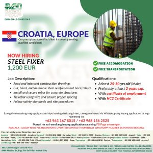 Filipino construction workers have a new opportunity in Europe as Placewell International Services Corporation announces hiring for Steel Fixers bound for Croatia.