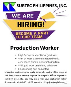 Job seekers looking for local employment opportunities can now apply as Surtec Philippines, Inc. announces its hiring for Production Workers at its facility in Laguna Technopark, Biñan, Laguna.