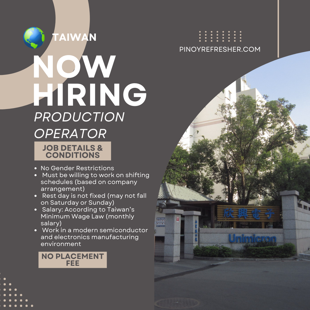 🇹🇼 TAIWAN JOB OPPORTUNITY – UNIMICRON TECHNOLOGY CORP. 🇹🇼 ✨ Continuous Hiring for Production Operators!Start your overseas career with a trusted Philippine recruitment agency and