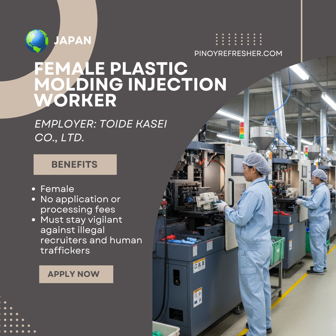 🔴 Urgent Hiring Alert: Female Plastic Molding Injection Worker Needed in Manila Mission Way Manpower Services, Inc. is urgently hiring Female Plastic Molding Injection Workers