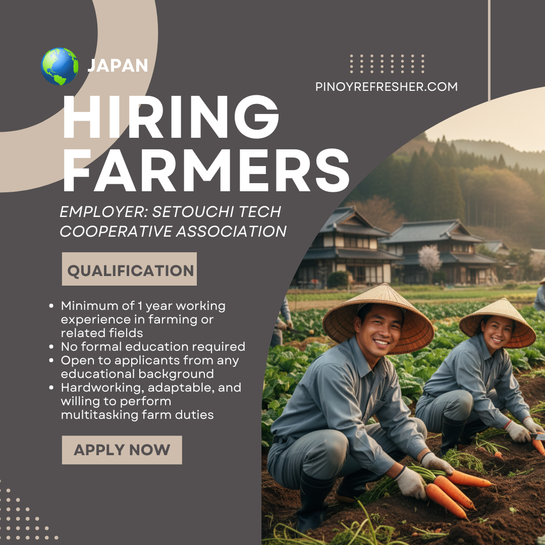 𝗨𝗥𝗚𝗘𝗡𝗧 𝗛𝗜𝗥𝗜𝗡𝗚 𝗜𝗡 𝗝𝗔𝗣𝗔𝗡 𝗙𝗔𝗥𝗠𝗘𝗥 | Net Salary 165,014 JPY (𝗣𝗛𝗣 𝟲𝟮,𝟮𝟰𝟯.𝟵𝟳) – TITP THREE (3) YEAR CONTRACT – MUST BE WILLING TO UNDERGO 3-4