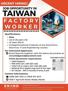 Filipino job seekers looking for overseas opportunities now have a chance to work in Taiwan 🇹🇼 as Grand Placement & General Services Corp. announces its urgent hiring for Factory Workers.