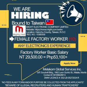 A new overseas employment opportunity is now open for Filipinas as Mighty Net Electronic Company Limited announces its search for female factory workers to join its operations in Hsinchu County.