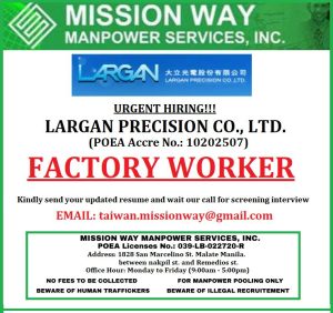 If you want to work in Taiwan as a factory worker, visit Mission Way Manpower Services Inc. for priority walk-in processing. Bring your updated documents and get ready to join a reputable company in the global manufacturing industry!