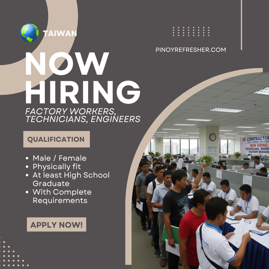 JS Contractor Inc., a trusted manpower agency since 1977, is now accepting applications for various technician, engineer, and factory worker positions with multiple reputable companies in Taiwan. Applicants can apply online in Manila or walk-in at the Cebu office.