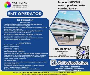 A promising overseas employment opportunity is now available for skilled Filipino workers as Top Union Electronics Corp. announces job openings for SMT Operators in Hsinchu.