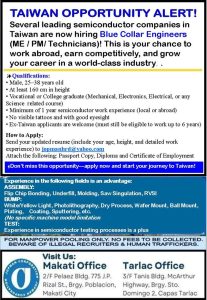 Philippines — Filipino professionals in the semiconductor field are being offered a strong opportunity to work abroad as several leading companies in Taiwan open hiring for Blue Collar Engineers, including Mechanical Engineers, Project Managers, and Technicians.