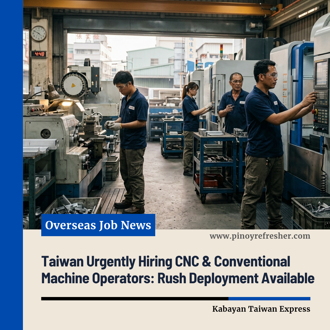 MANILA, Philippines — Skilled machine operators have a new overseas career opportunity as Taiwan ramps up its demand for CNC and conventional machine operators. This urgent hiring initiative offers a chance to work in one of the world’s most advanced manufacturing hubs, with competitive pay and fast deployment for qualified applicants.