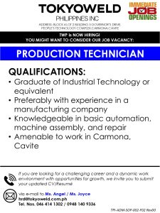 Tokyoweld Philippines Inc. Announces Immediate Hiring for Production Technicians