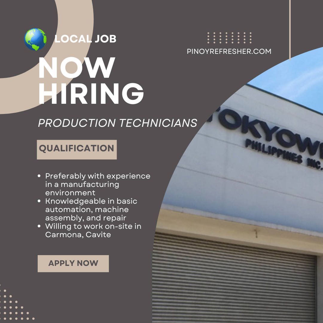Looking for a rewarding career in a fast-paced manufacturing environment? Tokyoweld Philippines Inc. is now urgently hiring Production Technicians to join its growing team. This is a great opportunity for skilled individuals looking to build a long-term career with a trusted and respected company.