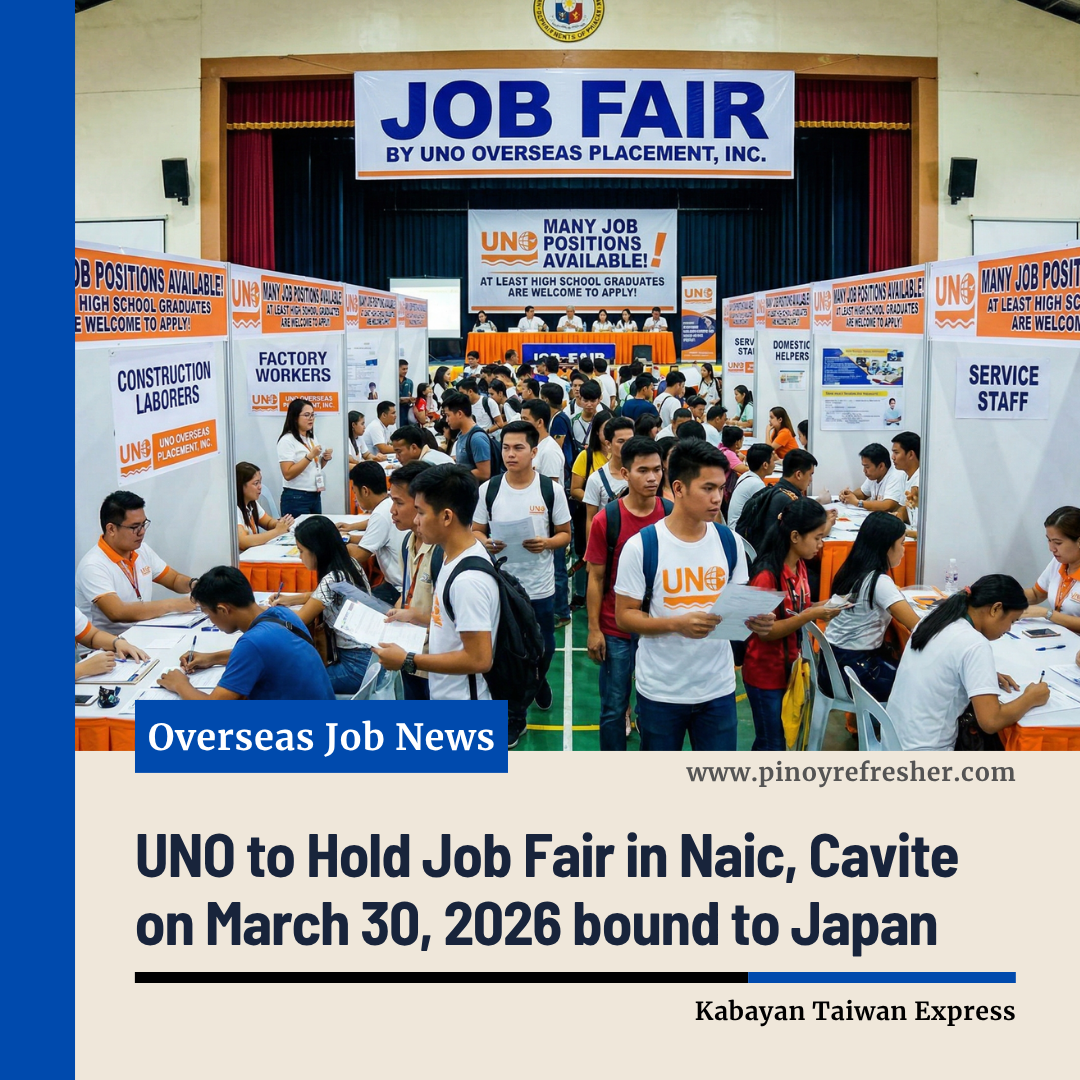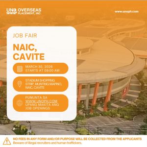 NAIC, Cavite — Job seekers in Cavite and nearby areas will have the opportunity to explore overseas employment as UNO Overseas Placement, Inc. brings its recruitment event to the province on March 30, 2026.