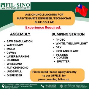 ๐ŸŒ ASE Chungli continues to hire skilled Filipino technicians for advanced semiconductor operations in Taiwan, offering a valuable opportunity for experienced workers in the electronics industry.