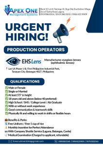 Batangas, Philippines — Apex One Management Systems, a leading manufacturer of ophthalmic (eyeglass) lenses, is urgently hiring Production Operators to support its expanding operations in the optical manufacturing sector.