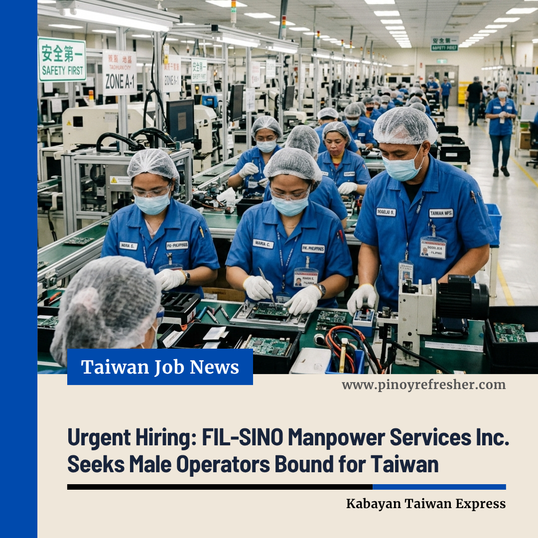 ParaΓ±aque City, Philippines β FIL-SINO Manpower Services Inc. has announced an urgent hiring for Male Operators bound for Taiwan, offering job seekers a chance to work overseas with no placement fee required. πΌβ¨
