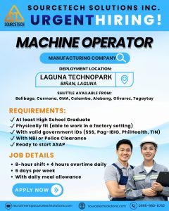 Laguna, Philippines — Job seekers looking for stable factory employment now have a new opportunity as Sourcetech Solutions Inc. announces urgent hiring for Machine Operators assigned to a manufacturing company located at Laguna Technopark.