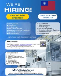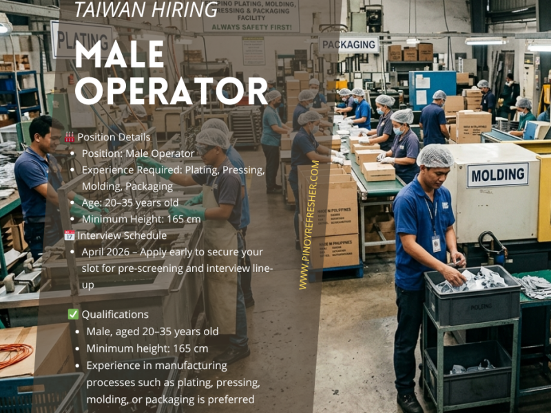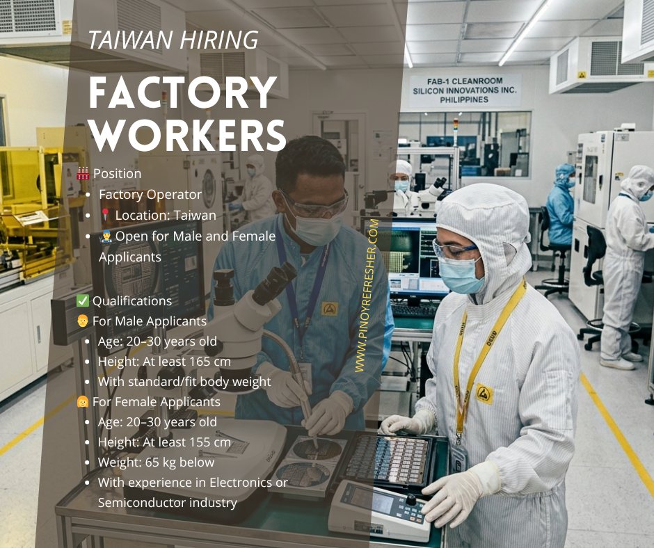 Are you looking for an opportunity to work abroad? We are urgently hiring Factory Operators for deployment to Taiwan. This is your chance to work in a stable manufacturing environment, especially in the electronics and semiconductor industry.