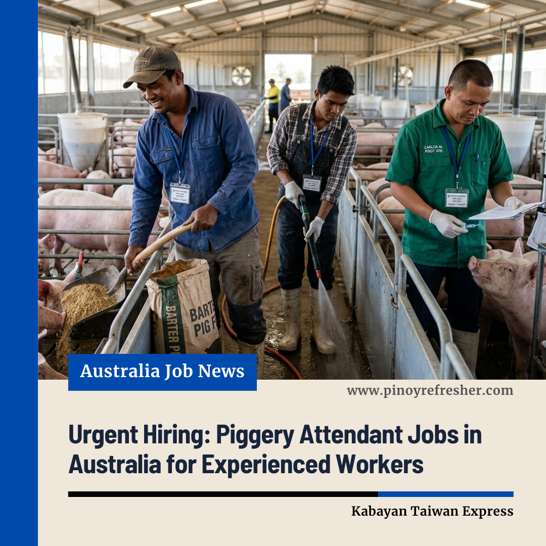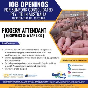 This opportunity provides skilled Filipino piggery workers a chance to work in a modern and well-regulated agricultural environment in Australia. With strong demand for experienced livestock workers, this role offers a pathway to stable overseas employment and career growth.