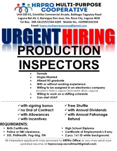 Job seekers in the Philippines now have an immediate employment opportunity as HRPRO Multi-Purpose Cooperative announces urgent hiring for Production Inspectors in an electronics company located in Laguna Technopark.