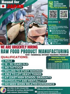 Muntinlupa City, Philippines β€” An exciting overseas opportunity is now available for Filipino workers as Tai-Fil Manpower Services Corp. announces urgent hiring for a Raw Food Product Manufacturing Internship Program in Japan. 🌏✨