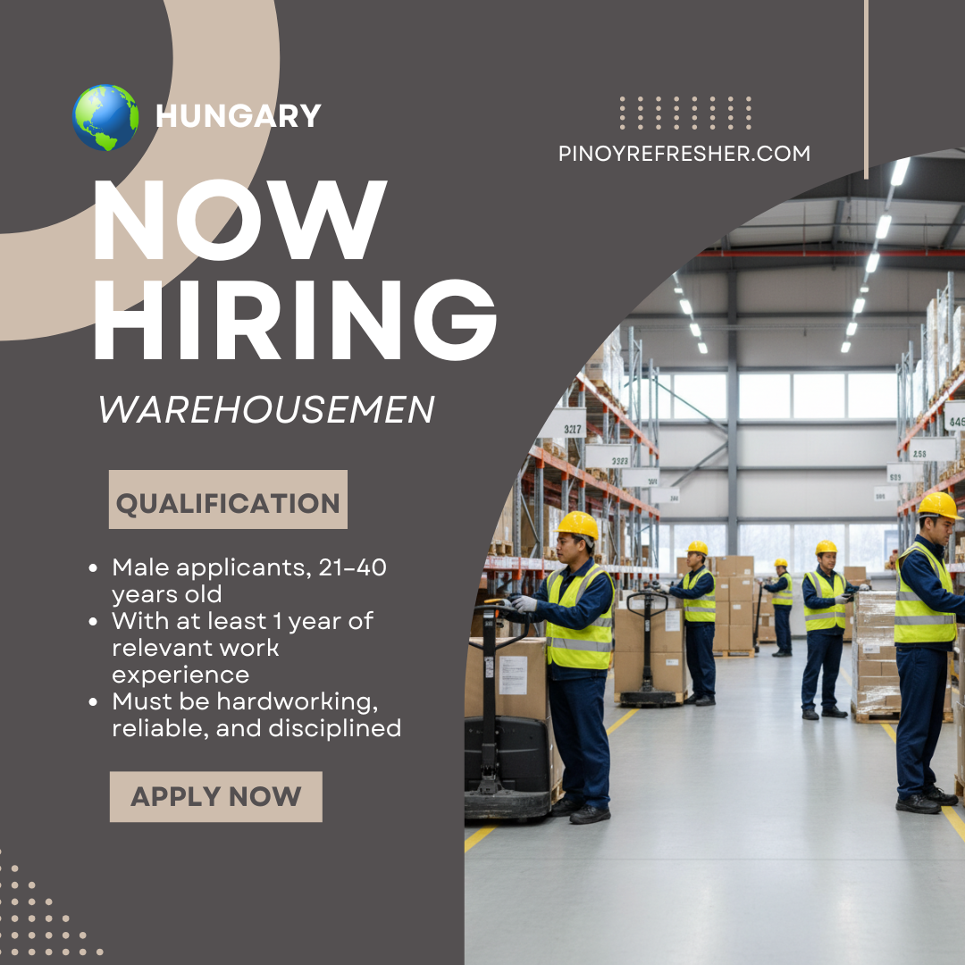 Are you ready to take your career to the next level? Skyhigh Manpower Recruitment International Inc. is urgently hiring Warehousemen for an excellent job opportunity bound for Hungary. If you are hardworking, efficient, and eager to build an overseas career, this role could be your gateway to success!