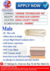 A new overseas employment opportunity is now open as TAIMIDE Technology Inc. announces urgent hiring through a webcam interview process for qualified Filipino applicants bound for Taiwan πŸ‡ΉπŸ‡Ό. The company is looking to strengthen its workforce in its manufacturing facility located in Miaoli County.