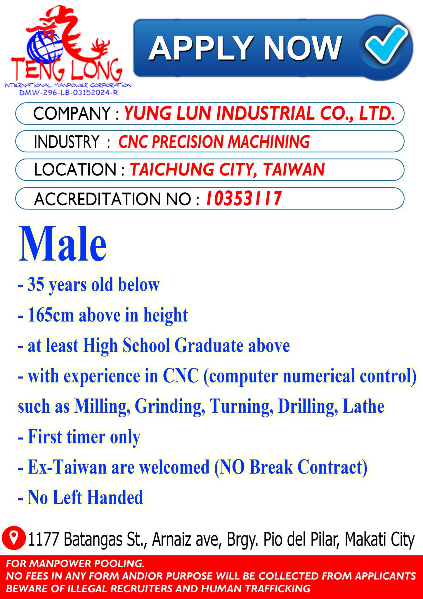 📌 Urgent Hiring: Yung Lun Industrial Co., Ltd. – CNC Precision Machining (Taiwan)