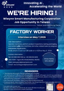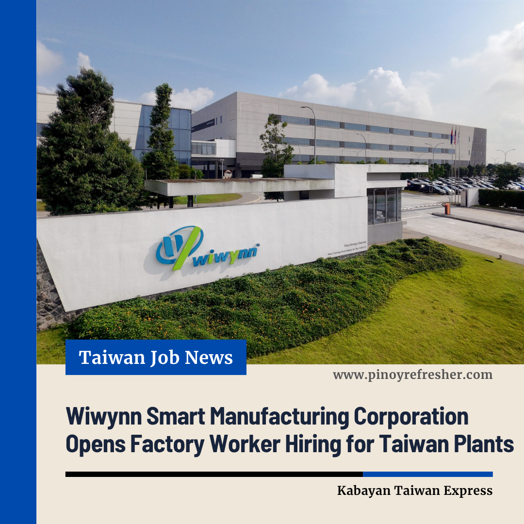 Manila, Philippines β€” Wiwynn Smart Manufacturing Corporation has announced a new manpower pooling recruitment for Factory Workers bound to Taiwan πŸ‡ΉπŸ‡Ό, offering opportunities to work at its advanced manufacturing facilities in Tainan and Kaohsiung.