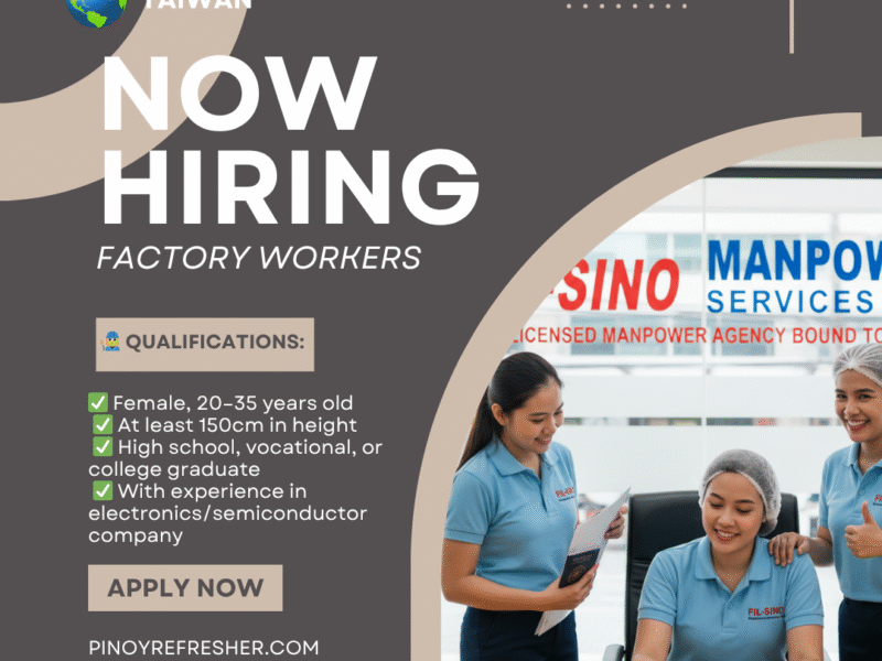 πŸ‡ΉπŸ‡Ό NOW HIRING: MALE FACTORY WORKERS – BOUND FOR TAIWAN πŸ‡ΉπŸ‡Ό