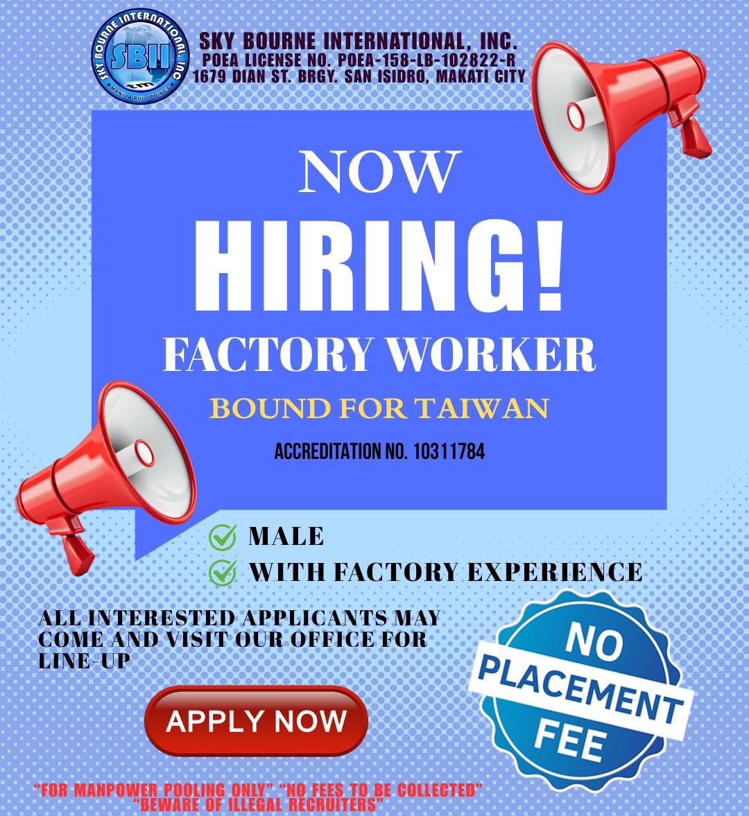 Sky Bourne International Inc. (POEA License No. POEA-158-LB-102822-R) is urgently hiring Male Factory Workers for employment in Taiwan!