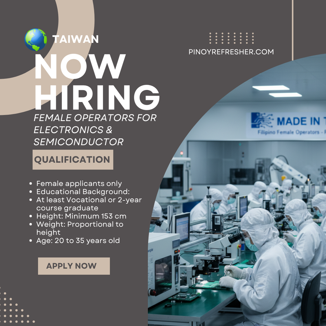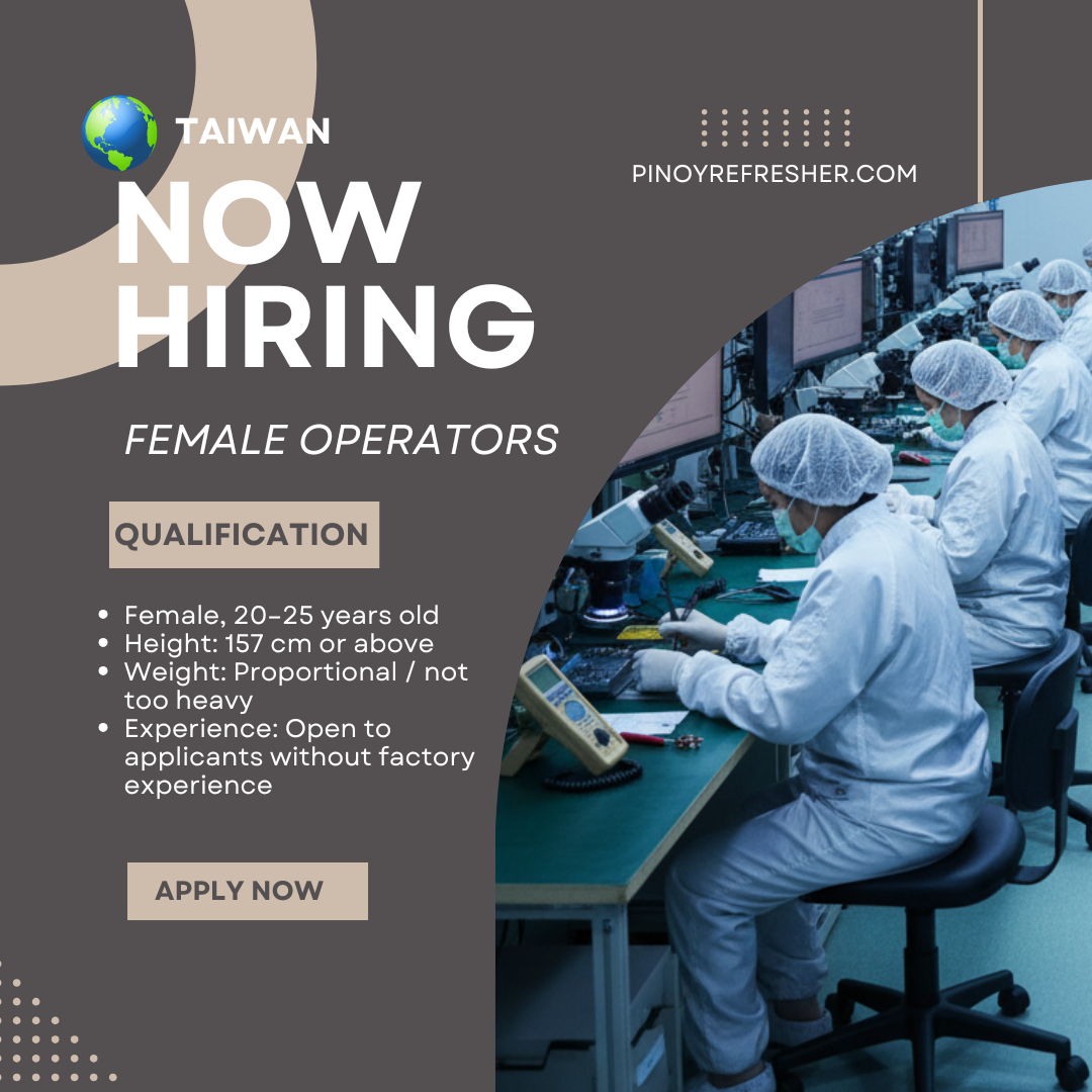 📢 Urgent Hiring: Female Operators for Taiwan | Manpower Pooling Only JS Contractor Inc. (JSCI) is urgently seeking female operators for manpower pooling opportunities in