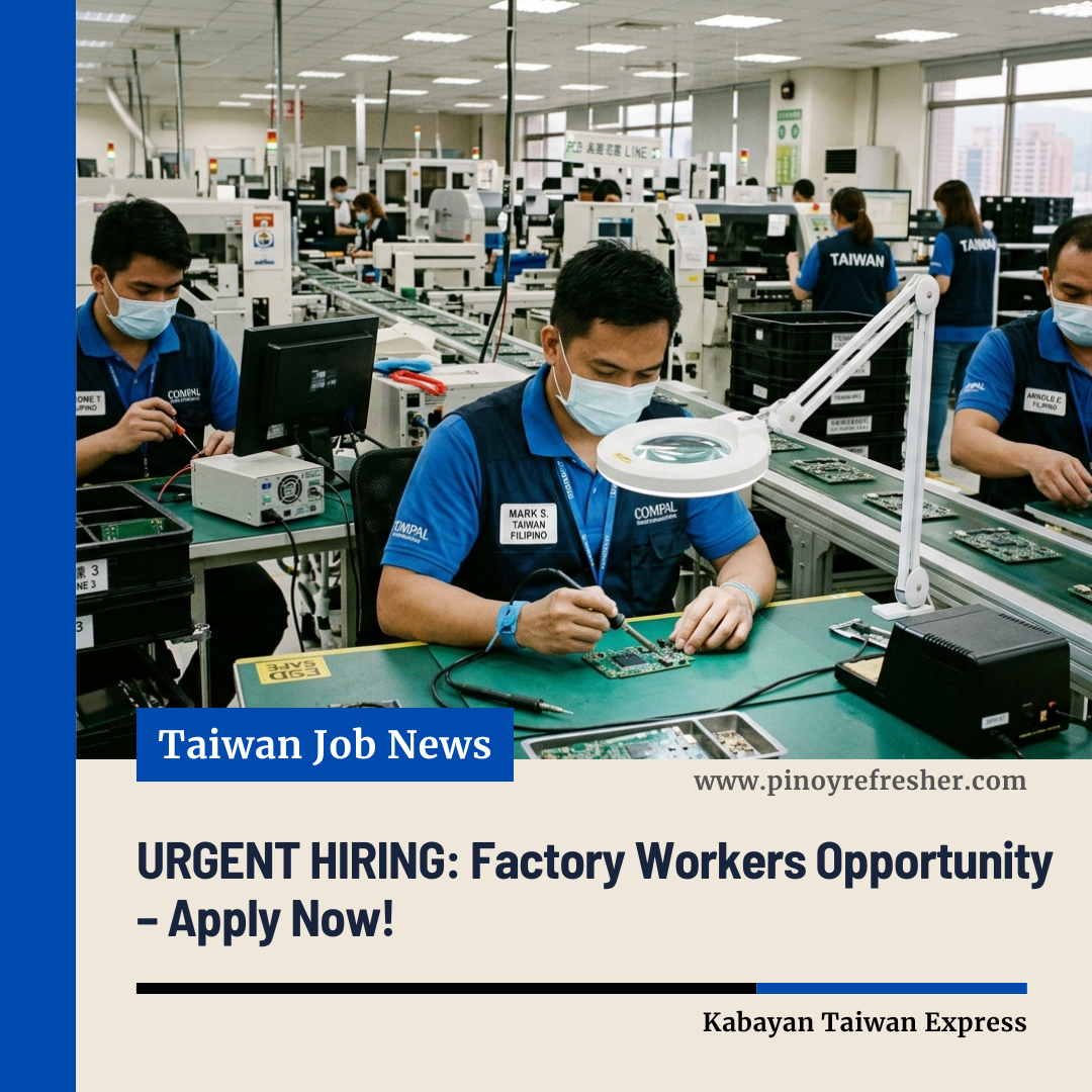 🇹🇼 URGENT HIRING: Factory Workers Opportunity – Apply Now! 🏭 A new overseas recruitment opportunity is now open for Filipino job seekers as a manufacturing